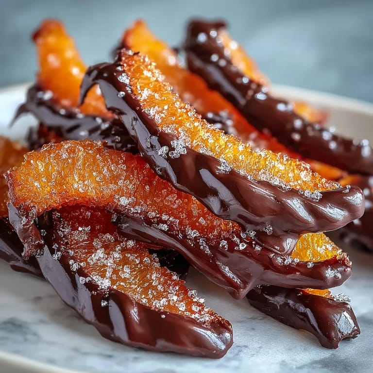 Save to Pinterest There's something almost meditative about standing at the kitchen counter with a sharp knife and a pile of orange peels, knowing that in a few hours they'll transform into something that tastes like candied sunshine wrapped in dark chocolate. My grandmother used to make these every winter, and I'd watch the peels slowly turn glossy and translucent in the simmering syrup, the whole kitchen filling with this bittersweet citrus warmth. The first time I tried making them myself, I rushed through the blanching steps and ended up with peels so bitter I nearly threw the batch away—until she gently reminded me that patience with the water changes was the real secret. Now, whenever I make a batch, it's both a meditation and a small rebellion against store-bought candies that taste like nothing.