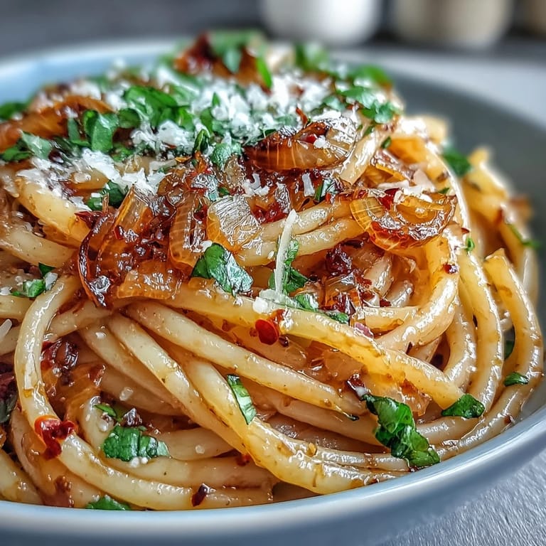 Long strands like spaghetti, linguine, or fettuccine coat beautifully with the oily sauce. Short shapes like penne or rigatoni also work well, catching the caramelized onion pieces and chili oil in their ridges and tubes.