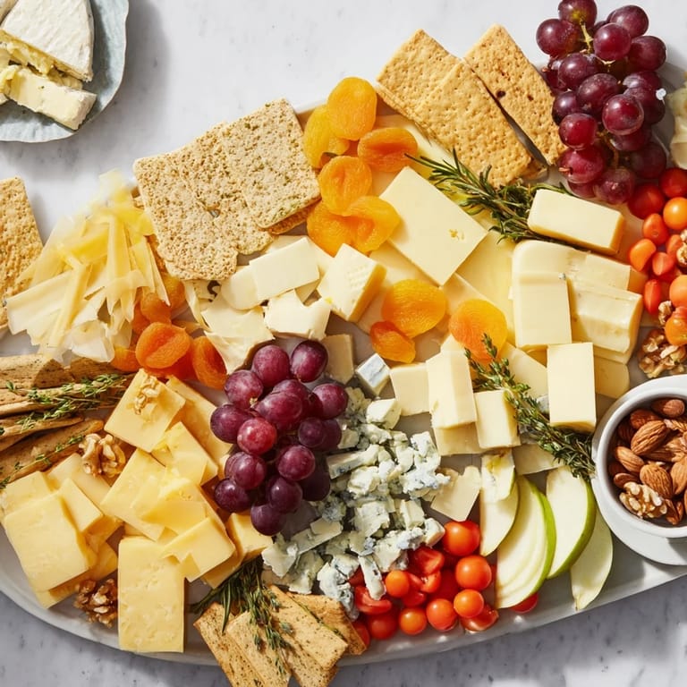 The genius of this spread is its flexibility and generosity. If you have vegetarian guests, this is already perfect as is. For everyone else, add cured meats like prosciutto or salami tucked between the cheeses—they don't compete, they complement. Working with a small kitchen space? Use a wooden cutting board instead of a sprawling platter. Have guests with nut allergies? Double that amount of dried fruit and crackers, and double-check your cracker ingredients because some surprising ones contain tree nuts. The seasonal angle matters too: in autumn, swap grapes for fresh figs and pears. In summer, add fresh strawberries and peaches. This board is forgiving and smart enough to adapt to what you have on hand and what your guests need.