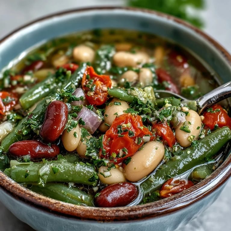 Save to Pinterest My neighbor showed up one afternoon with a mason jar of three-bean salad, the kind that sits in the fridge for potlucks, and I thought: what if this became soup instead? That tangy, bright flavor profile felt like it was meant for something warm and comforting, especially as the weather shifted. I started experimenting that evening, and what emerged was this vibrant bowl of color that tasted like summer had been liquified and seasoned perfectly. It's become the soup I make when I want something that feels both familiar and unexpectedly fresh.