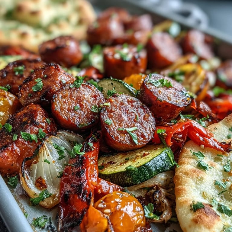 Save to Pinterest This Smoky Sheet Pan Sausage & Veggies with Naan is a vibrant, smoky one-pan meal featuring roasted sausage and colorful vegetables. Served with warm garlic naan perfect for dunking, it offers a fusion of bold spices and hearty textures that come together effortlessly for a satisfying dinner.